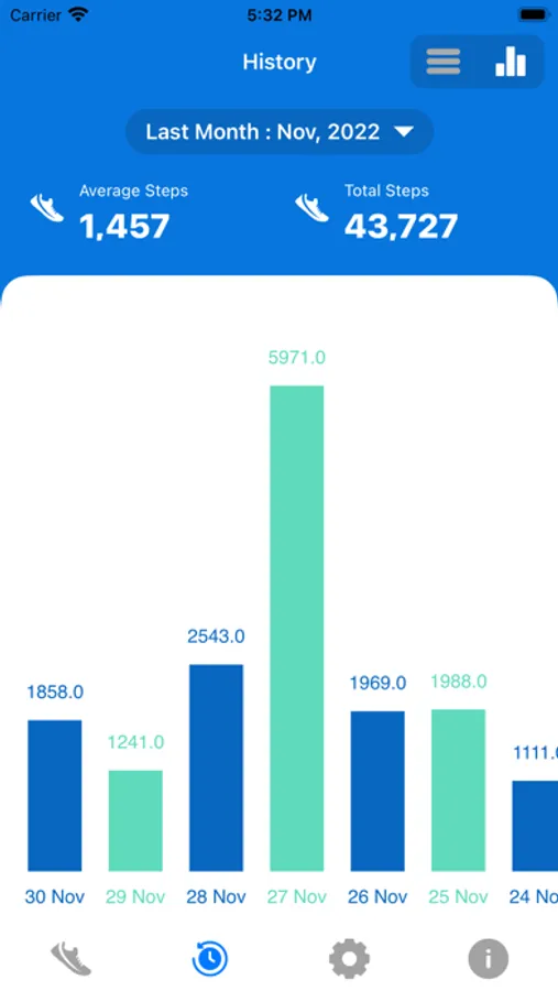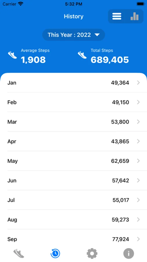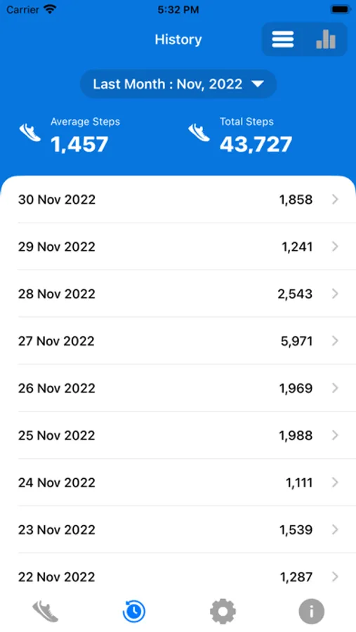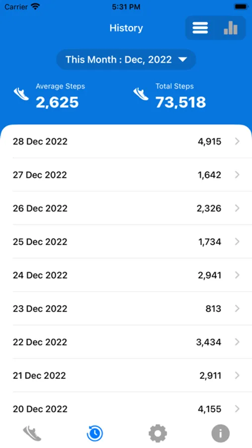 - Check your steps history based on weekly, monthly and yearly in list and also provide Graphical representation