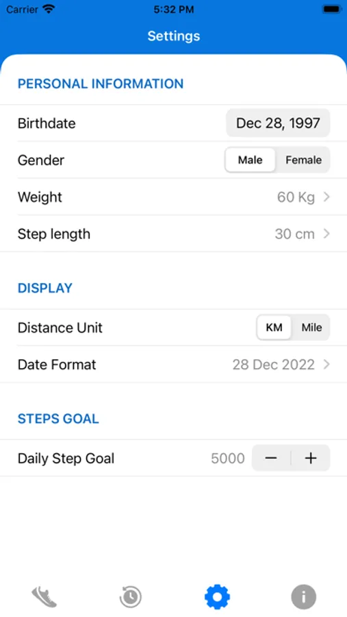 - In order to display the correct number of burned calories, please enter your birth date, gender, body weight and step length accurately