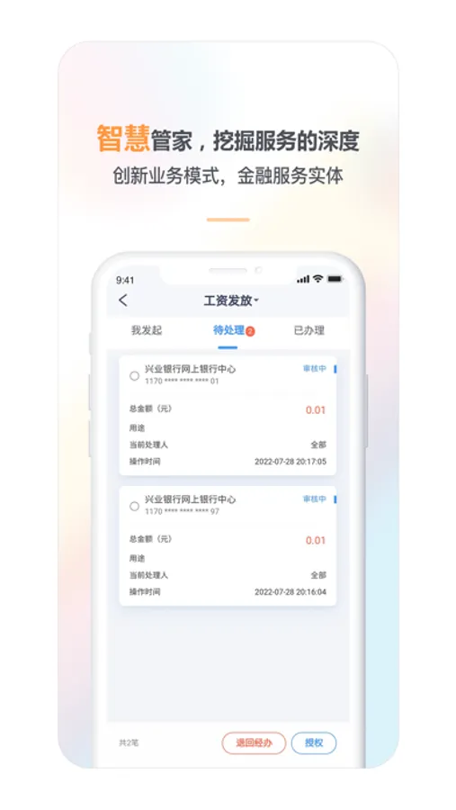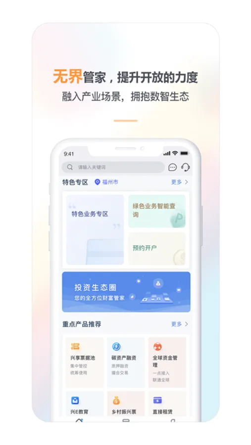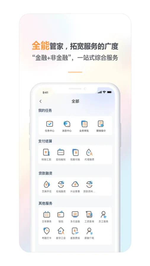 “兴业管家”为机关社团企事业单位客户提供了开放式、一体化、综合性的线上金融服务平台,让用户可以安全便捷地畅享财富管理、融资服务、支付结算、跨境金融和工资代发等金融服务;同时让用户舒心体验与企业日常生产经营相关的非金融服务,致力于“管钱管事,开放共赢”,为客户提供安全、便捷的移动金融服务。