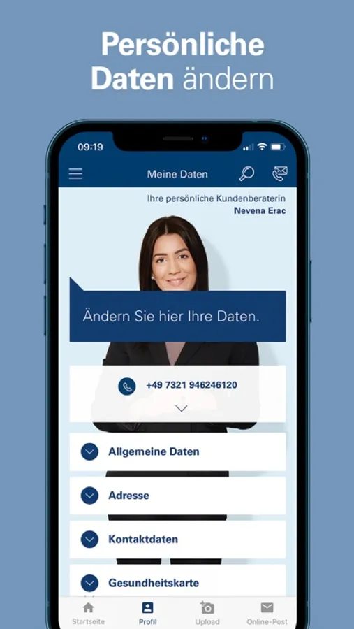 Verwalten Sie mühelos Ihre persönlichen Daten: Laden Sie das Foto für die Gesundheitskarte hoch, bestellen Sie bei Verlust eine neue Karte und halten Sie Ihre Daten und Einwilligungen aktuell.