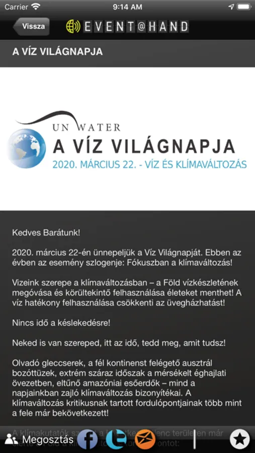 Az EVENT@HAND Víz Világnap alkalmazás minden évben az aktuális magyarországi Víz Világnappal kapcsolatos információkat tartalmazza.