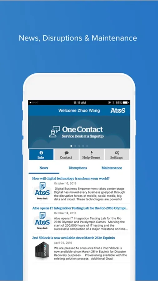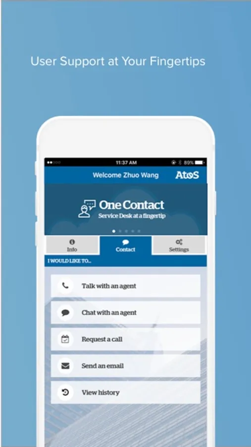 Atos OneContact is a unified user support solution. For end-users, it provides access to user support right at the fingertip with multiple communication channels – chat, voice, callback and email – anytime, anywhere and on any device. The application has been designed to support different location and languages. Atos OneContact is proactive in providing up to date information that’s relevant to you such as news, disruption, and maintenance.