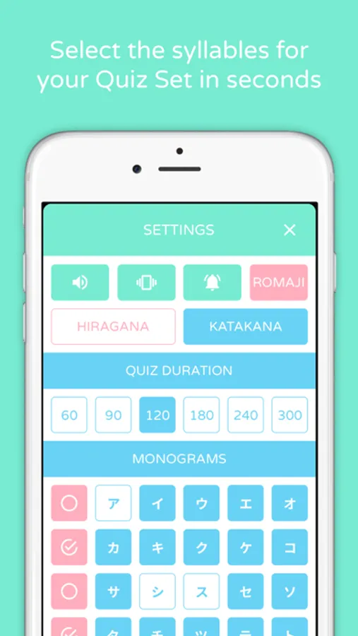 Use the new Quick-Select Buttons in settings to personalize your Kana Quiz Set in seconds.
