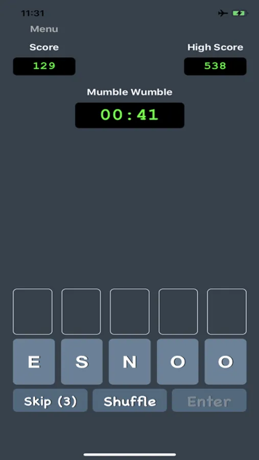 If you like the challenge of unscrambling words, then Mumble Wumble is the game for you! The goal of the game is to untangle as many 5 letter words in two and a half minutes as you can. The quicker you solve each word and the more consecutive solved words you get, the more points you earn. You can skip up to 9 words if you get stumped. Beat the clock, earn points, climb to the top of the leaderboard and earn bragging rights!