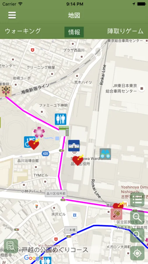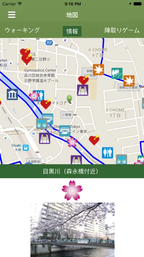 GPS機能が有効な状態で、品川区の主要観光スポットに行くと、アプリ内で「陣取り」が可能です。