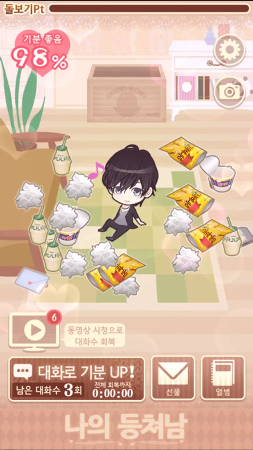 ・그가 어지럽힌 방을 청소하고 대화하여 돌보기 Pt를 모으세요!