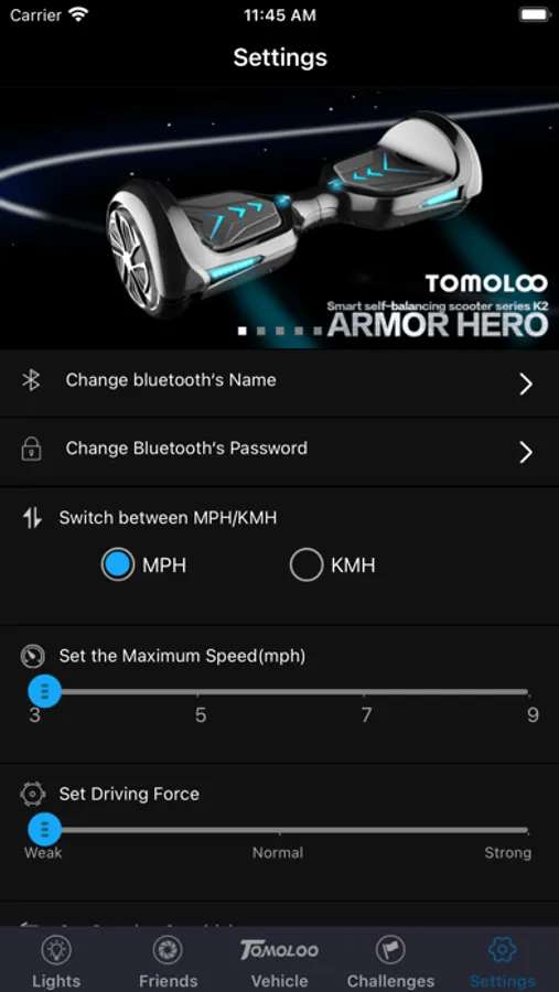 Configure the scooter Bluetooth name and password.Control the scooter light.Set the maximum speed, driving force, steering sensitivity to make riding more safety.