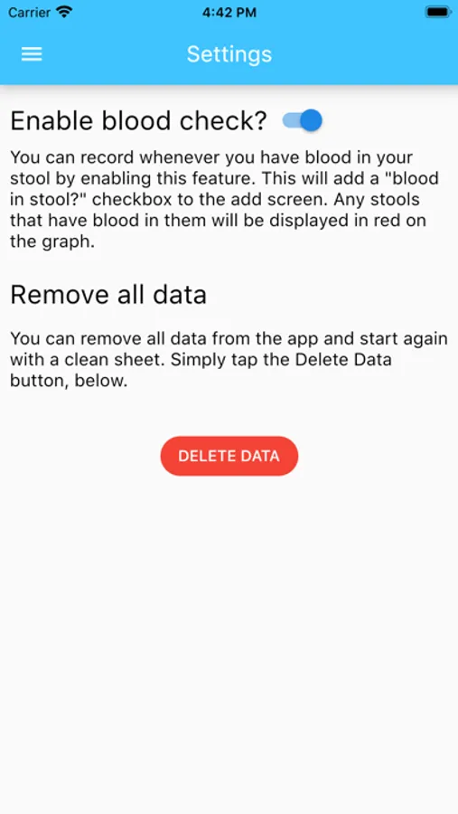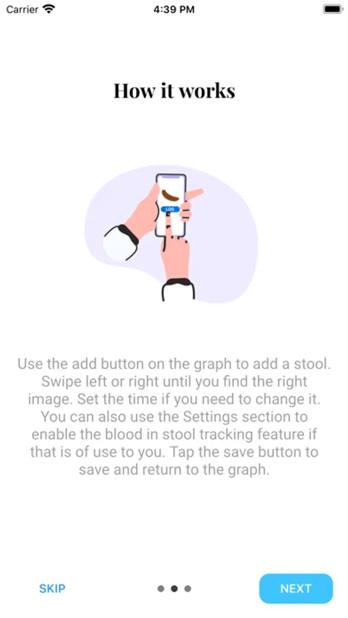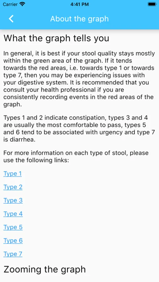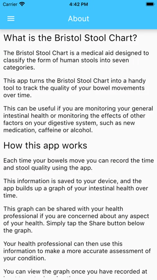 Stool quality is displayed as an easy to interpret graph which can be shared with your health professional. It also presents you with information about each type of stool along with links to more information online. Slick and easy to use, this tool makes it easy to monitor your digestive health.