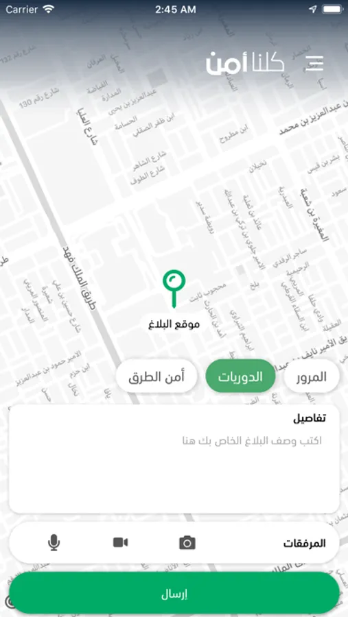 Kollona Amn is a utility that enables all citizens and residents in Saudi Arabia to play the role of a police officer. Which speeds up rescue missions and reduces damages and losses. Citizens and residents can send an incident by attaching a video or a photo or an audio note. In addition, citizens will receive updates on the status of their incidents.