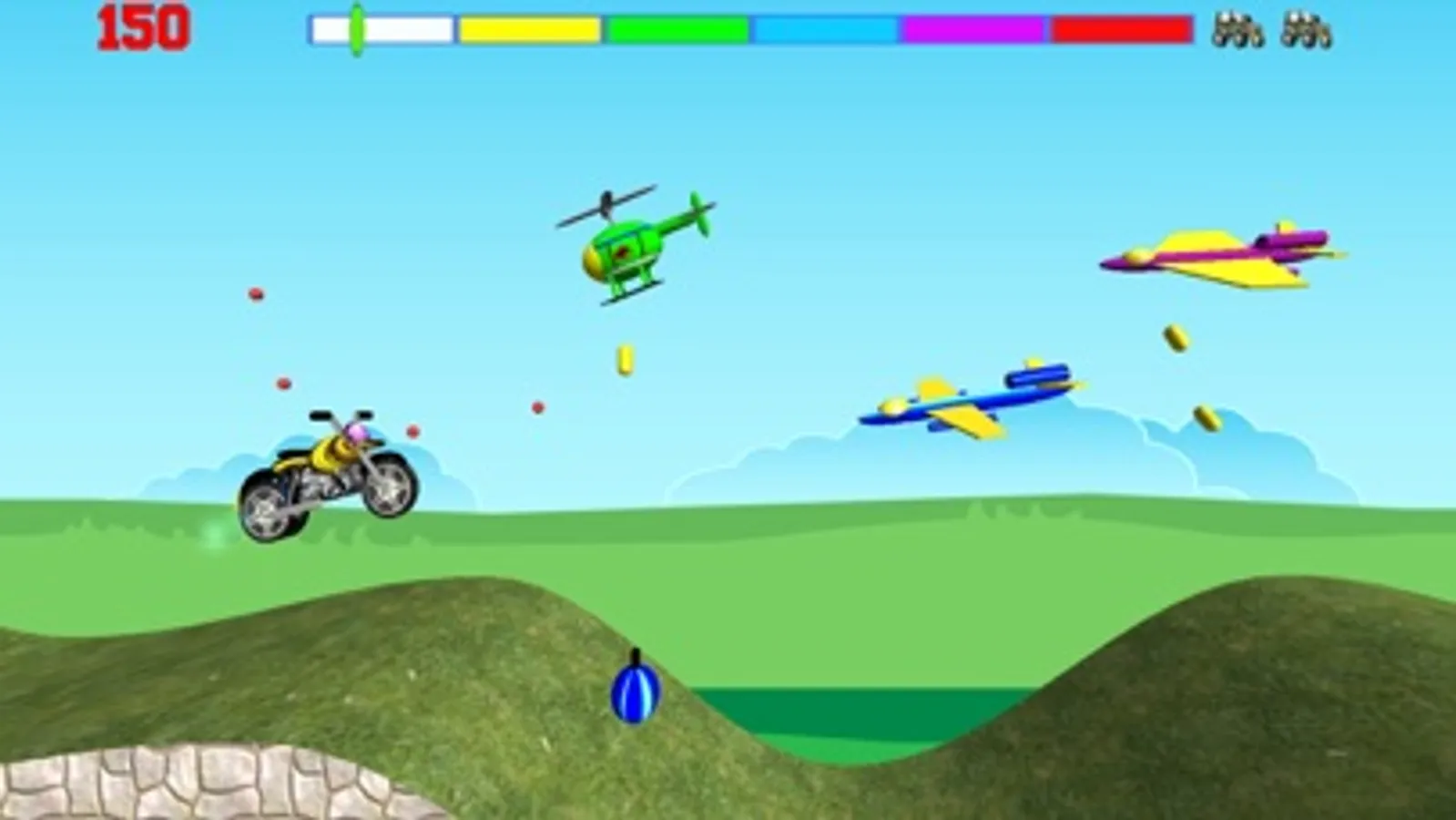 Enemy choppers will try to destroy your motorbike, luckily you are equipped mini cannons so you have ample fire power to defend your motocross bike.