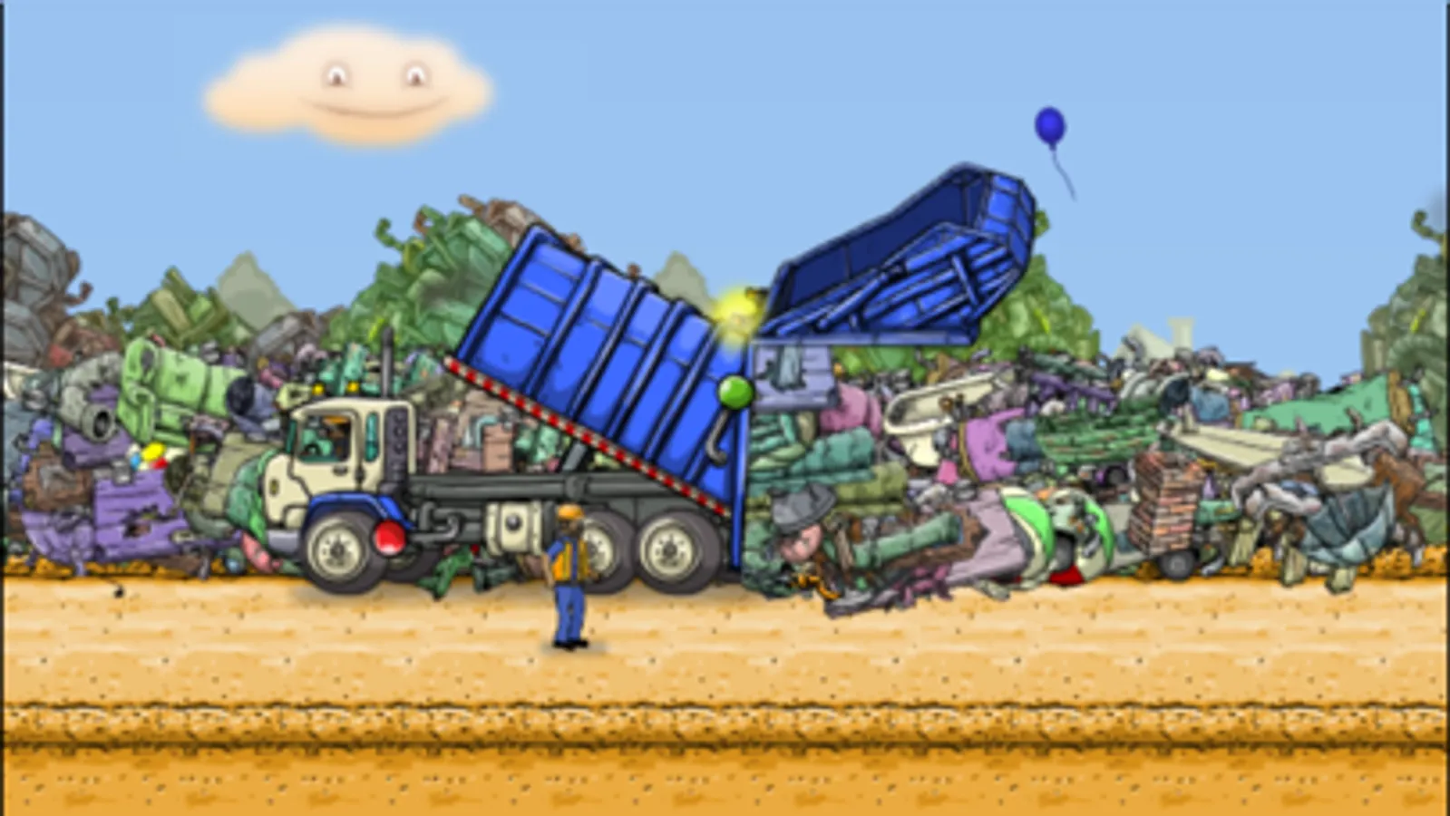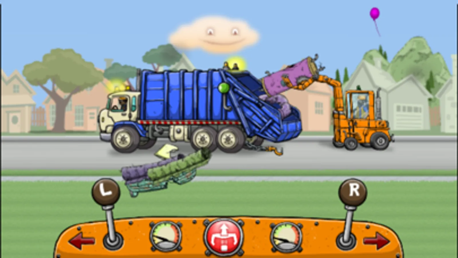 Ride along on the Bulky Trash Pick Up Garbage Truck as it drives through a neighborhood and stops to pick up all kinds of large, bulky trash thats way too big for garbage cans and way to heavy for garbage men to lift. Use the fun Articulated Loader to pick up the garbage items! Drive the Loader and use the claws to scoop up the bulky trash, then bring it to the truck's hopper and dump it in. Use the green knob on the side of the truck to operate the truck's compactor to squish the garbage! After three pick ups, visit the Good City Landfill to empty the truck! Then drive the Giant Compactor Truck to mash down a huge pile of garbage!