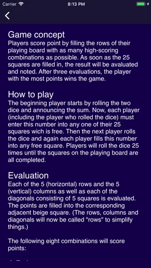 Players score point by filling the rows of their playing board with as many high-scoring combinations as possible. As soon as the 25 squares are filled in, the result will be avaluated and noted. After three evaluations, the player with the most points wins the game.