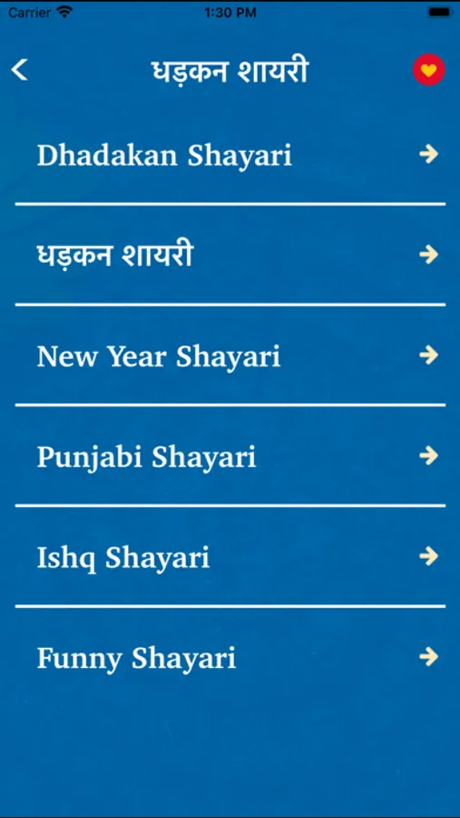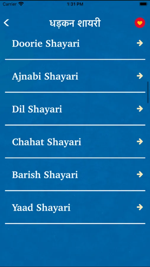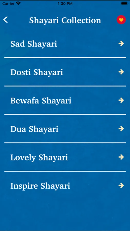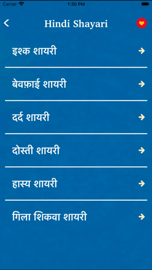 There are lots of shayari categories like love , infidelity , pain , friendship , humor , Gila regrets , ghazals , Bollywood , Urdu , wine , birthday , congratulations , lovers , writer of poetry , other poetry , remember , wait , good night , Good morning.