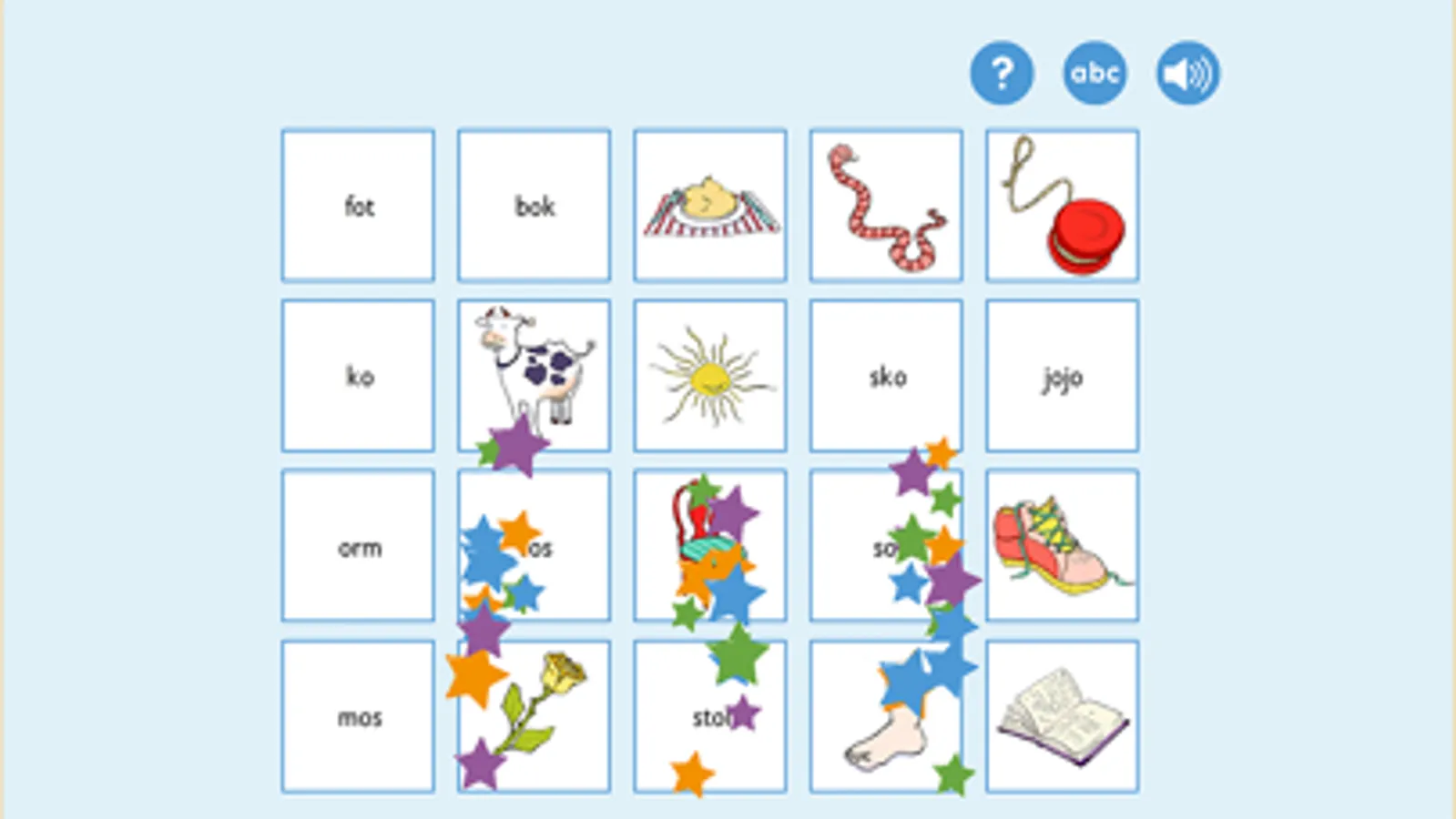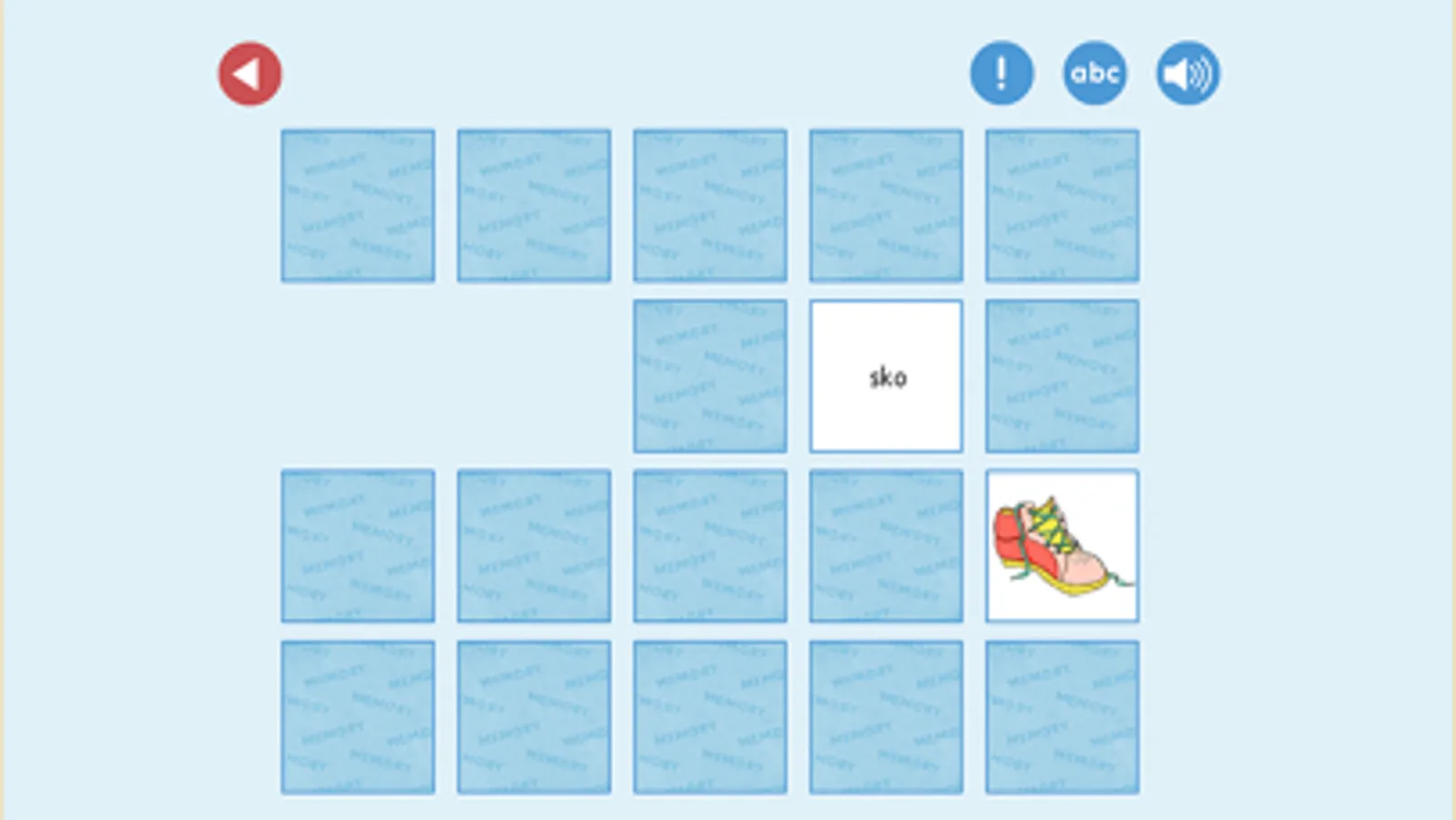 I ABC-memo tränas särskilt förmågan att läsa kortare ord och para ihop ordet med en bild. Välj två kort. Om orden hör ihop bildar de ett par och försvinner från spelytan. Om de inte hör ihop vänds de tillbaka och ligger kvar. När alla par är hittade är spelomgången slut och spelaren får en stjärna som belöning.