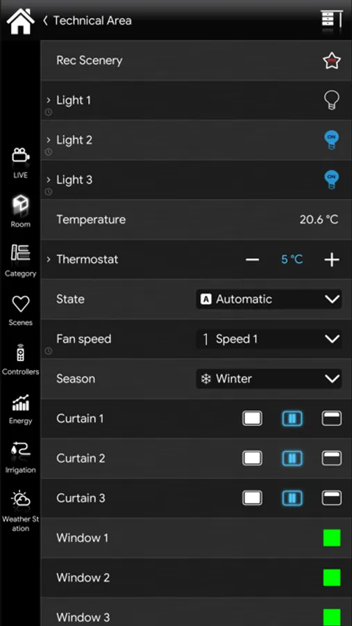 - Lights (On / Off, dimmer, DALI, RGB)