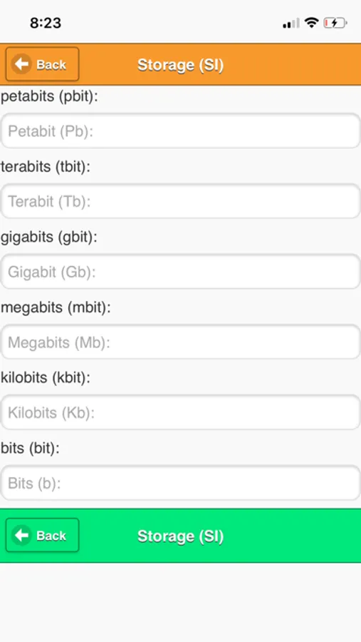 Storage size conversion (IS) - Bits, Kilobits, Megabits, Gigabits, Terabits, and Petabits.