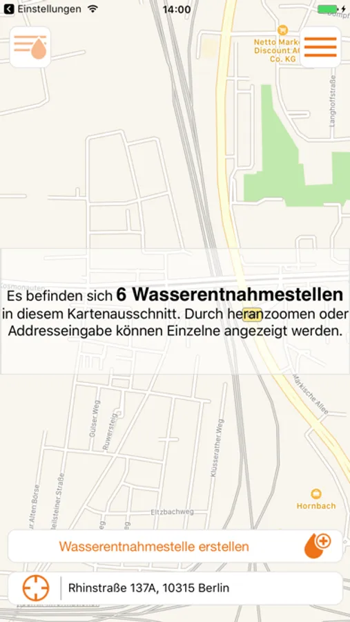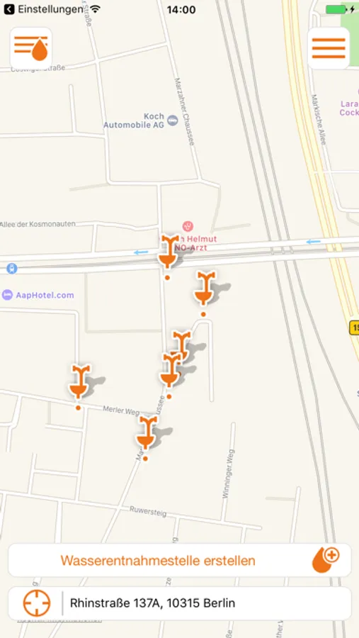 The DOWSER App provides you with the ability to show water intake points in your immediate surrounding on a street map. A separate listing of all water intake points in your vicinity allows maintaining an overview. A new "feature" is the display of water intake points in your vicinity sorted by the distance from your location.