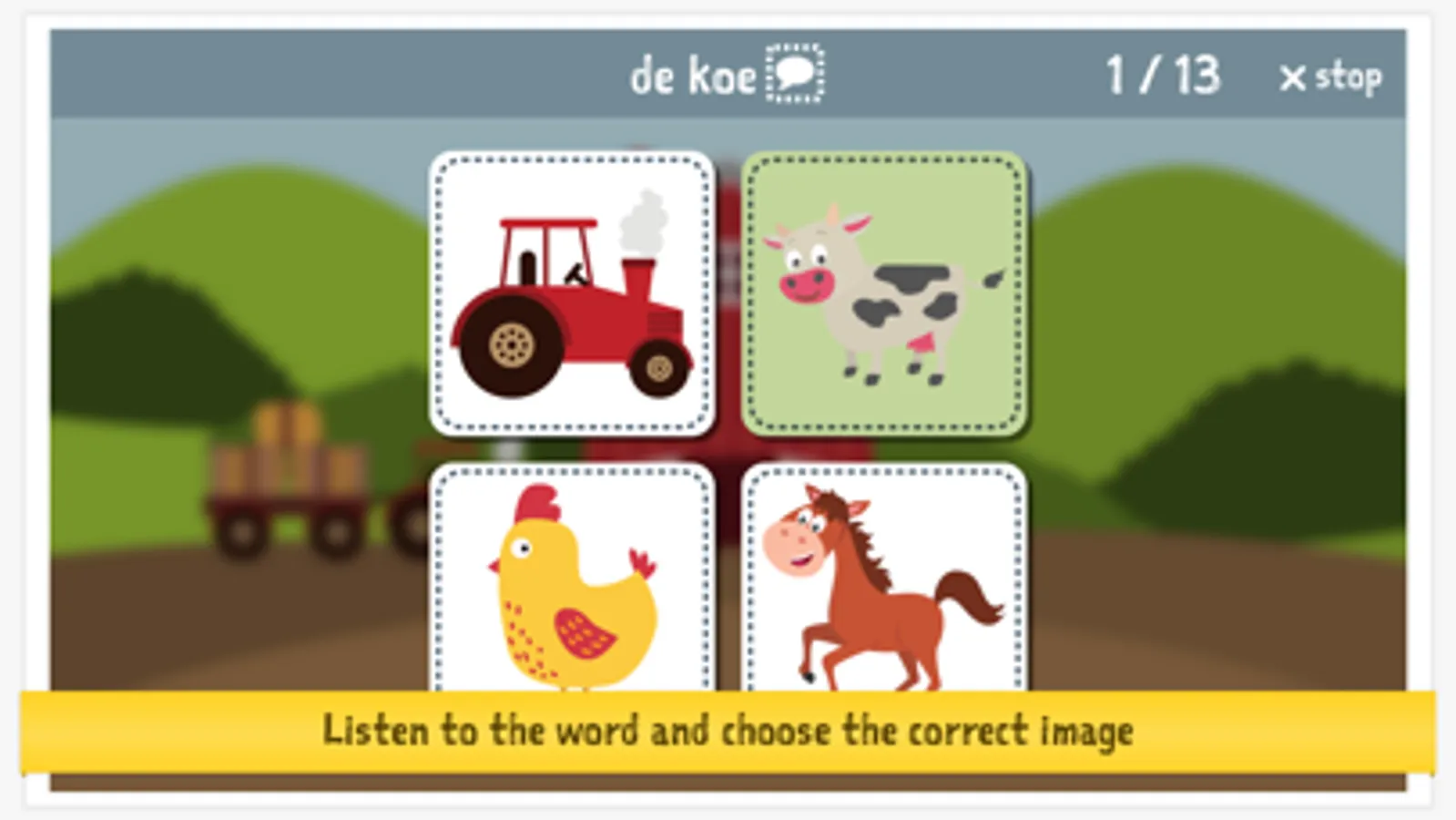 Words: tractor, koe, kip, paard, kat, hond, eend, geit, hooi, muis, varken, schaap, and eekhoorn.