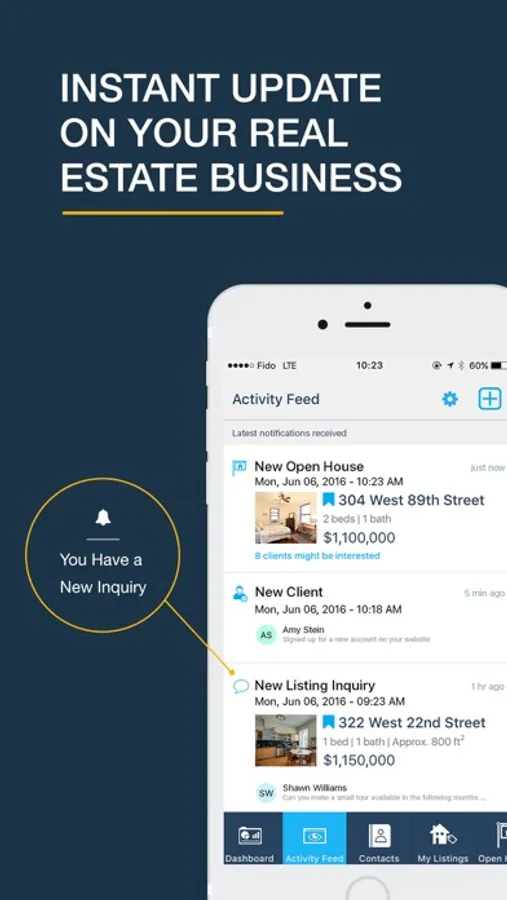 - Receive notifications of new listings, open houses, new clients visiting your website, inquiries and more