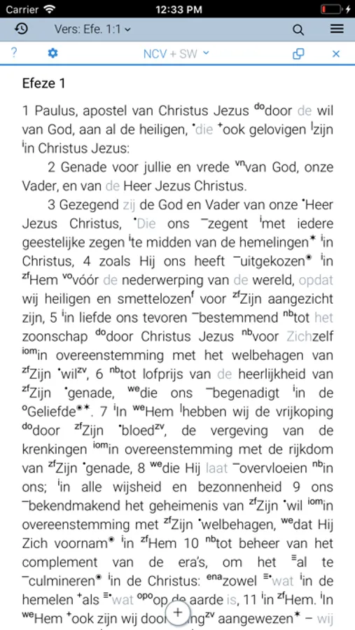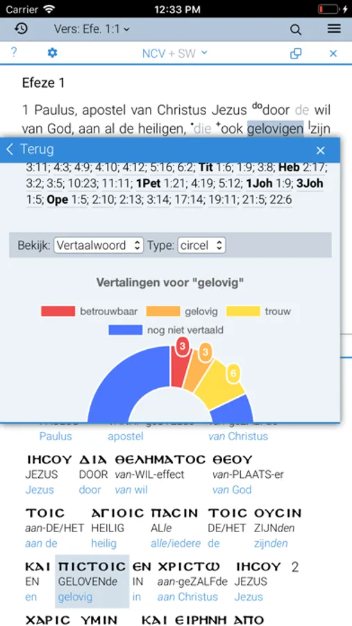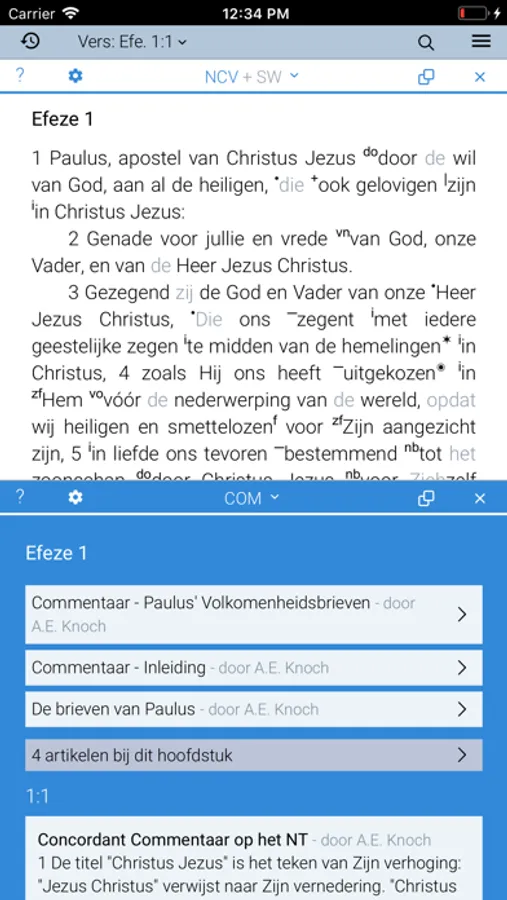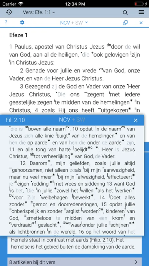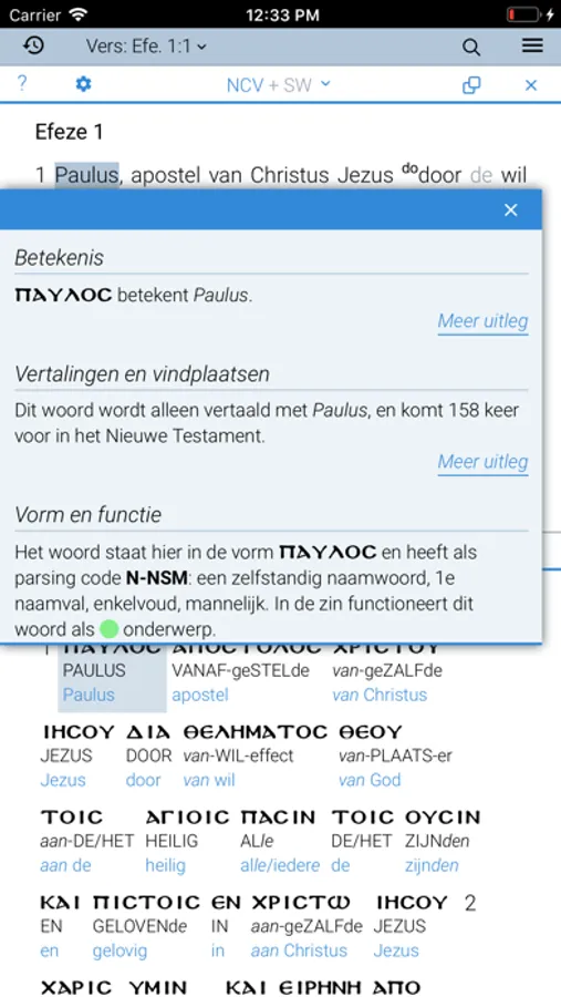 Met de NCV Bijbelstudie app heb je alle tools voor je Bijbelstudies. Het bevat de Nederlandse Concordante vertaling, wat een zeer letterlijke vertaling van de grondtekst is. Klik op een woord voor extra informatie over dit woord en om woordenboeken te raadplegen. Ook kun je het interlineair bekijken - de Griekse of Hebreeuwse tekst met onder elk woord de letterlijke betekenis en andere informatie over dat woord. Alles om te kunnen onderzoeken 'wat er staat geschreven'. Andere vertalingen en teksten kunnen afzonderlijk gedownload worden.