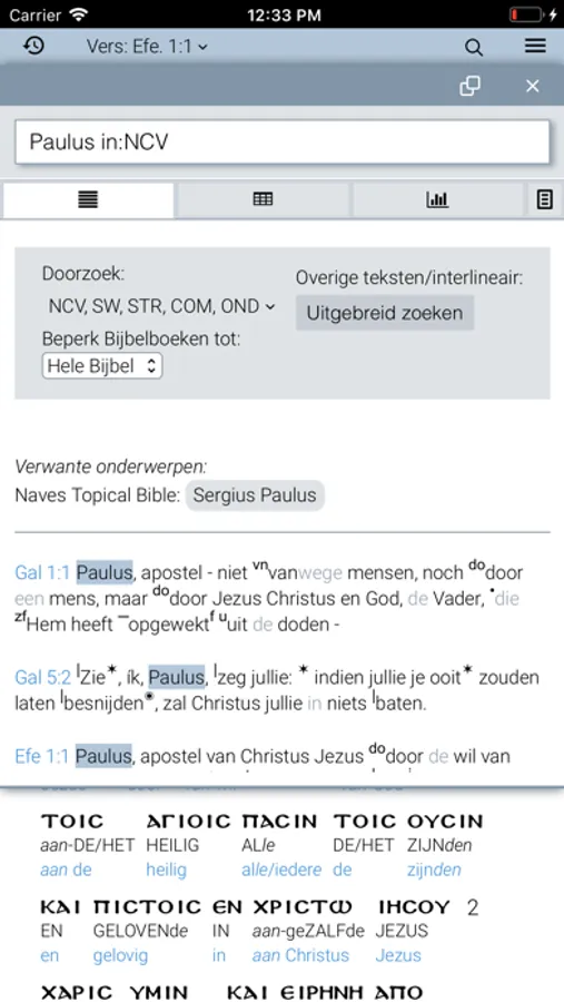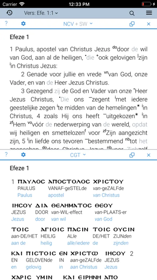 Ook kun je meerdere teksten parallel openen en met verschillende groepen ook verschillende tekstplaatsen naast elkaar openen. Ook zitten er krachtige zoekmogelijkheden op om teksten en het interlineair te doorzoeken op een enkel woord of meerdere woorden per vers.