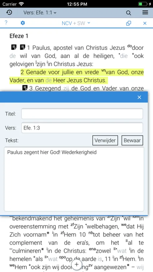 Om de tekst persoonlijker te maken kun je notities toevoegen en verzen highlighten. Als je dan een account aanmaakt, worden je notities en highlights gesynchroniseerd op al je apparaten.