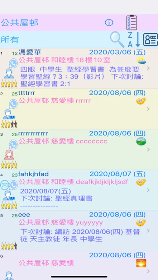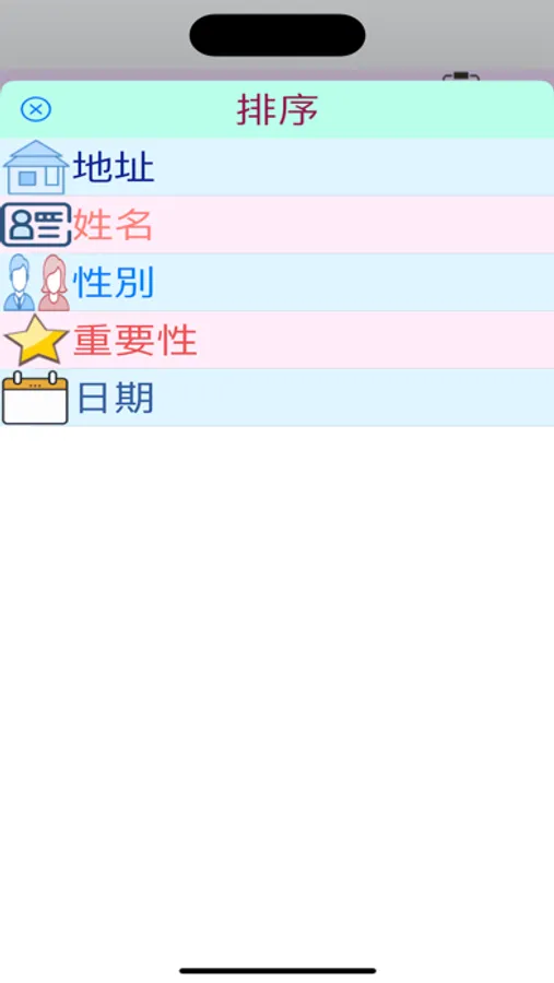 - 提供兩個細項分類、搜尋(姓名、地址和備注)和5項排序(地址、姓名、性别、重要性和日期)。註:中文以拼音排序。