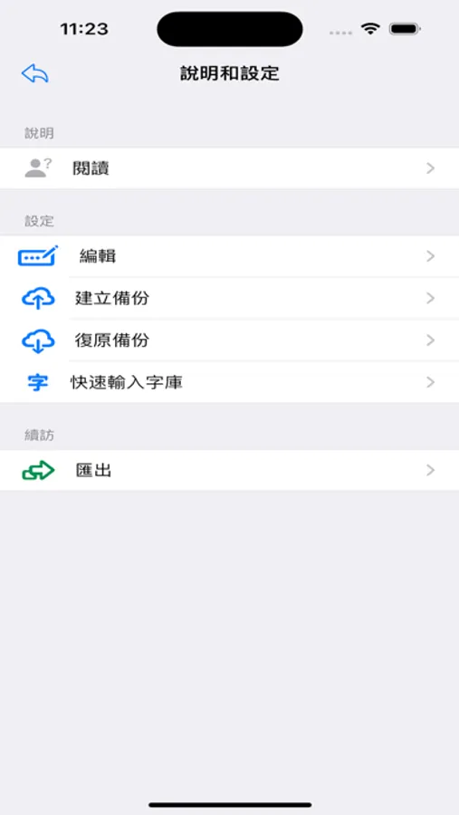 - 可以為設定好的細項分類及快速輸入字庫建立備份。