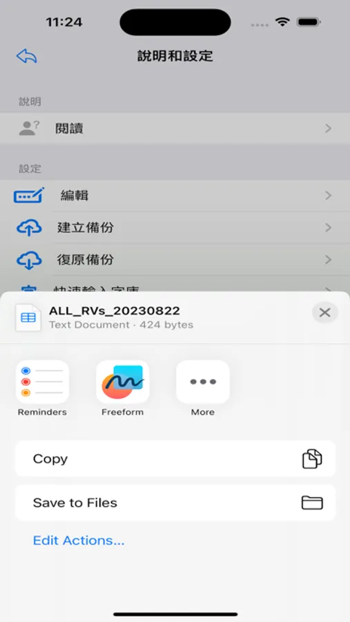 - 可把續訪分享到列印、AirDrop、剪貼簿或手機上其他App。選項多少視乎手機上安裝了多少可接受“文字檔”的Apps。