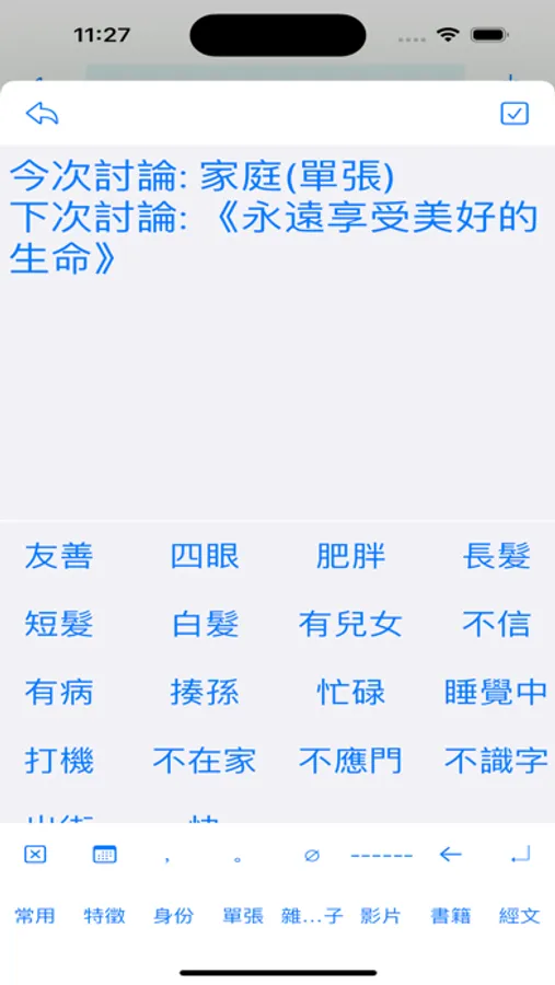 - 提供快速輸入字庫。預設題目(可自行修改):常用、特徵、身份、單張、雜誌册子、書籍和經文。
