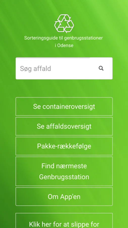 I denne app kan du søge på affald, og få at vide hvilken container affaldet skal i. I øjeblikket understøtter app’en alle 8 genbrugsstationer i Odense Kommune.