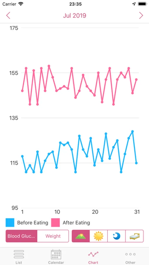 • Can record your blood glucose in the morning, noon and evening, as well as your weight on that day