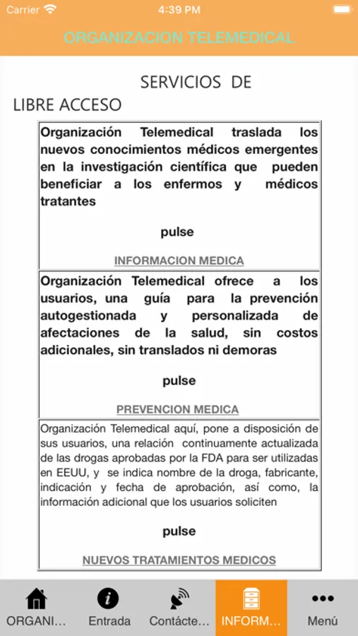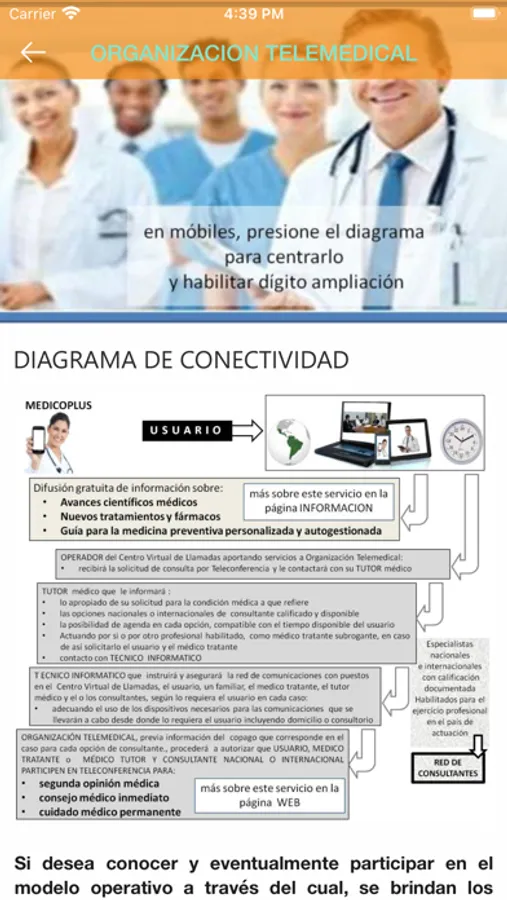 Consejo, Opinión y Cuidados Médicos cuando los necesita y donde los necesita. Esta es la Aplicación de Organización Telemedical para que médicos y pacientes de Iberoamérica puedan comunicarse, sin demoras ni traslados, por teleconferencias en su idioma, desde su laptop, táblet o teléfono celular, con médicos consultantes nacionales o internacionales, para obtener un consejo inmediato, una segunda opinión o un cuidado permanente durante un tiempo indicado
