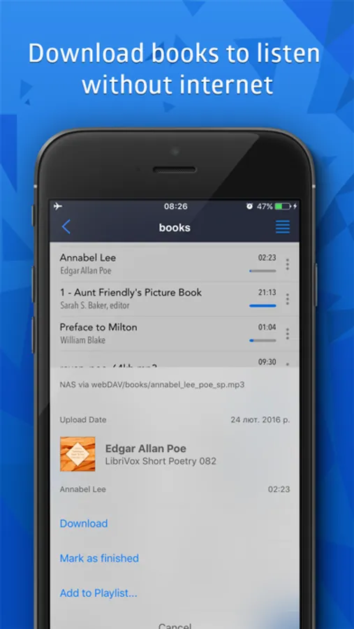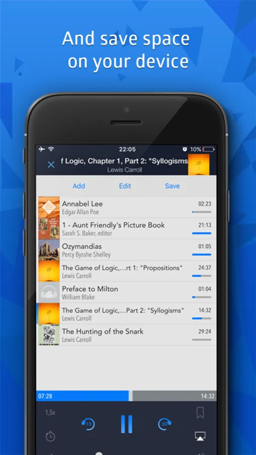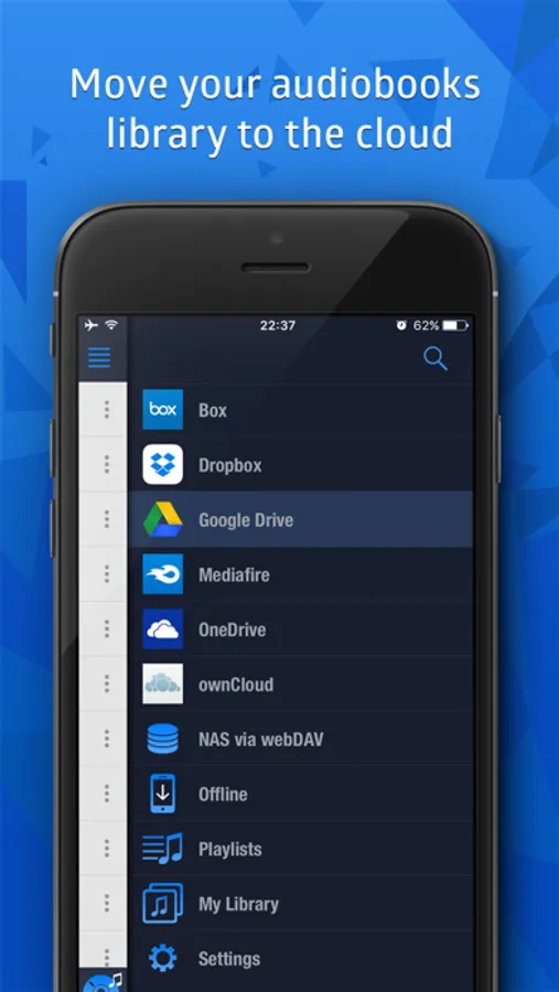 Listen to your audiobooks, podcasts, lectures and other audio files anywhere directly from Google Drive, DropBox, OneDrive and more. Save space on your device as you no longer need to keep large audio files on your iPhone and sync with iTunes.