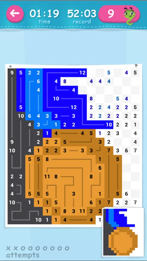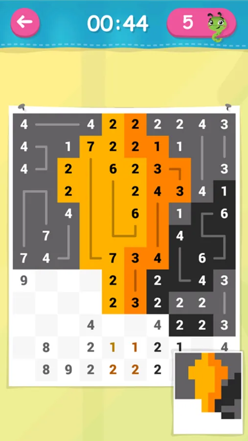 Simple rules, light usefull design, puzzles that make you think, but don't blow your mind a lot. What else do you need for a pleasant pastime. A funny little worm will help you if you have difficulties with coloring by numbers.
