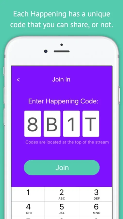 Every happening is given a private join code that allows anyone you invite to contribute their pics. Keep 'em secret, or blast out the code for everyone to see, it's up to you.