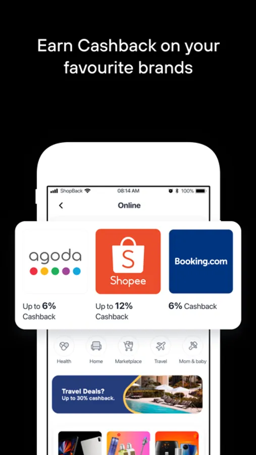 • TRAVEL: Choose from Booking.com, Agoda, Expedia, Klook and more to get Cashback on your flight, hotel bookings, and anything travel-related.