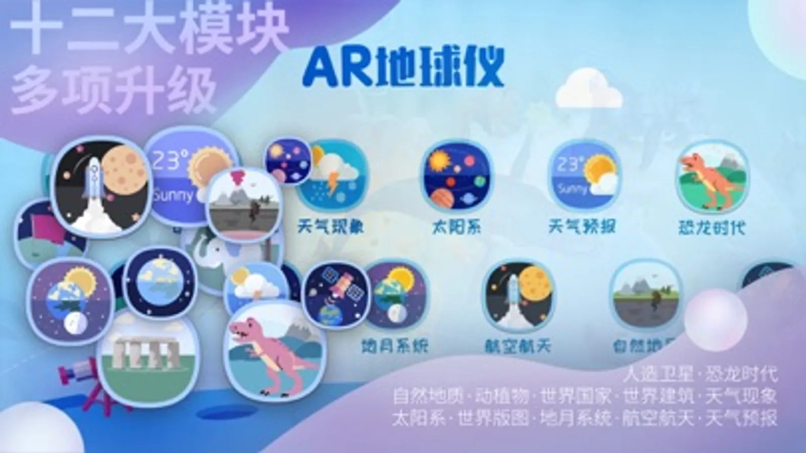 《AR地球仪 - 开启探索世界新时代》是基于 AR(增强现实)技术开发的益智早教启蒙 APP。APP 以地球为载体辐射世界范围内的地理、人文、生物、天文等8大门类知识系统,为孩子呈现一个与众不同的地球百科体验。著名建筑百余个国家惊艳亮相,国旗飘扬内容知识满满,各大洲大洋版图轻松分清,航天设备遨游太空,雷雨雷电经历自然奇观,各地动植物陪孩子们一起玩耍,找到黑天白昼的真正答案,探知太阳系八大行星的奥秘……《AR地球仪 - 开启探索世界新时代》为孩子打开地球知识大门。