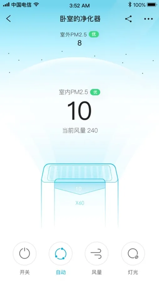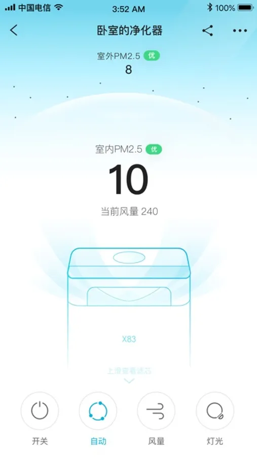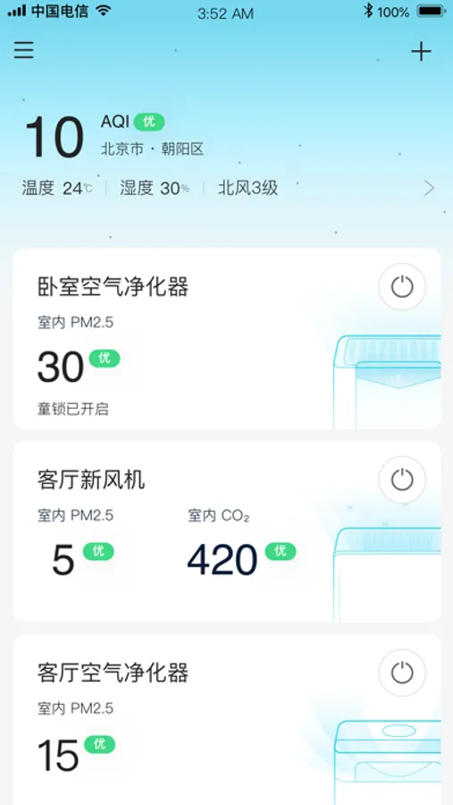 【352Air】可将352品牌的【X83系列空气净化器】、【X50/X60/X50S空气净化器】、【G30/G45新风净化机】、【M25检测仪】等空气净化产品通过Wi-Fi接入互联网,实现远程控制、实时数据与历史数据查看,并可在空气净化器与检测仪、新风净化机之间实现联动净化,同时还可以查看中国300多个城市的室外空气质量数据、空气质量地图及3日内AQI预报,也具备设备共享、固件更新、社交分享等功能。