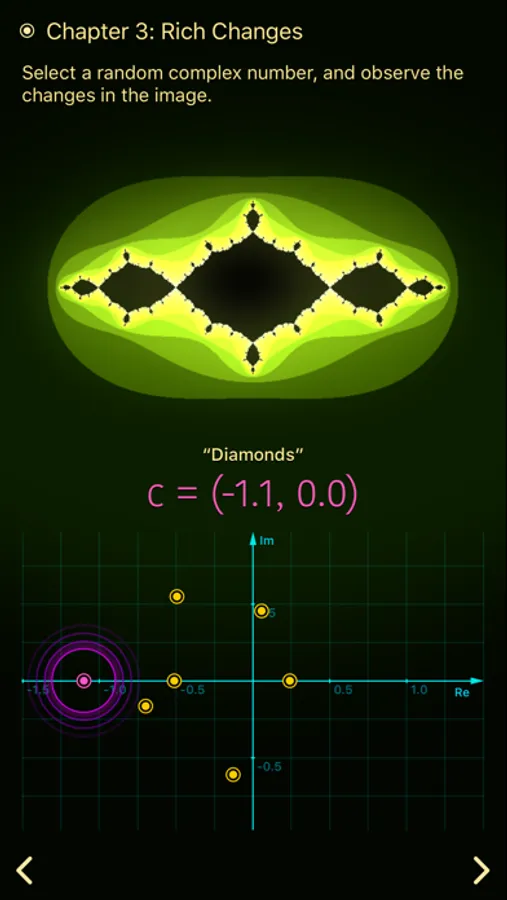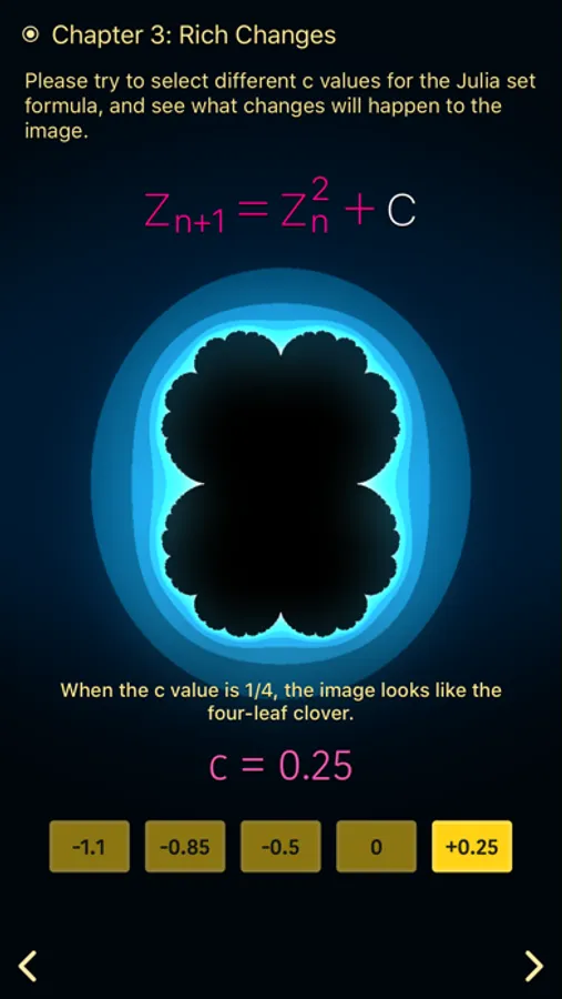 • Three chapters of interactive material take you to learn about the basic concept of Julia set and how it generates amazing fractal images.