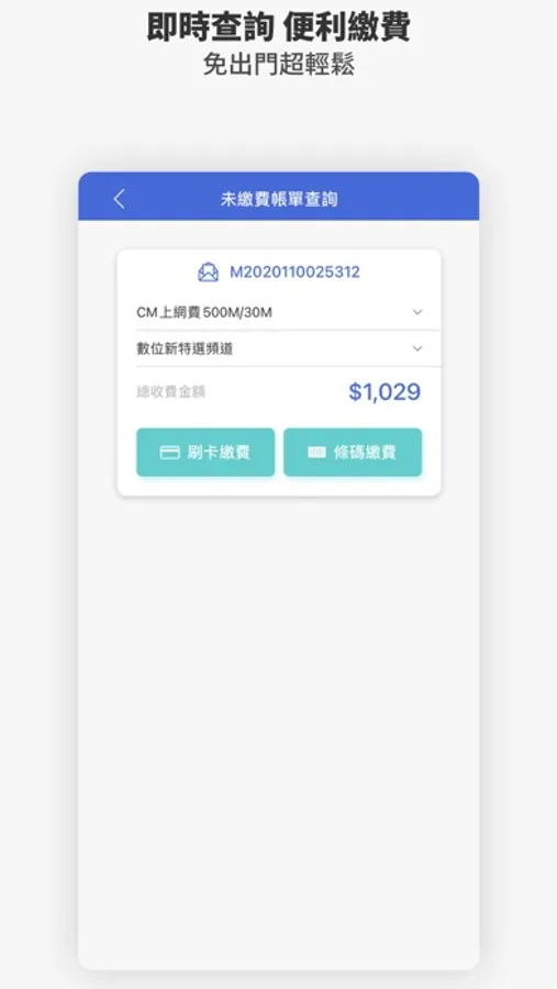 1. 帳務繳費:未繳費帳單以信用卡或條碼繳費、繳費記錄查詢、定期繳費申請、電子發票、繳費方式…