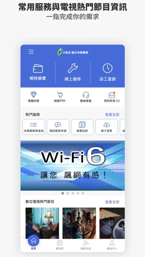 大新店客服App提供「帳務繳費」、「障礙協助」、「節目表」、 「熱門節目推薦」等功能,讓您透過手機就能獲得「有線電視及寬頻網路」帳務/障礙/節目…等相關服務。