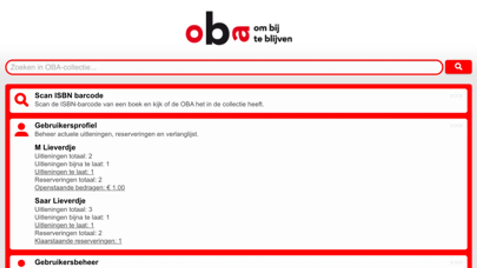 - overzicht van alle vestingen van de OBA, met per vestiging openingstijden en adresgegevens (eventueel weergave via Google Maps)