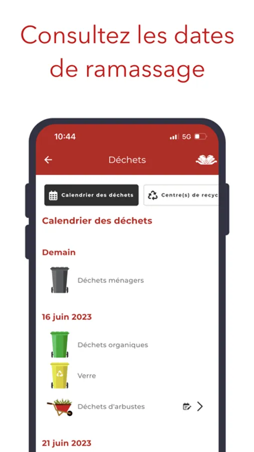 - Accédez aux dates des ramassages des déchets et recevez une notification pour vous rappeler de sortir les poubelles