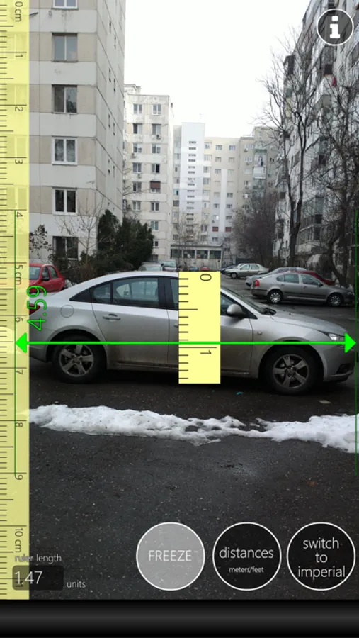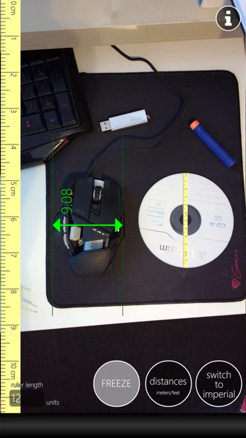 -measure large objects with help of augmented reality. fit a ruler on a know object on screen and star measure everything; for example make ruler of 12units and fit it on a DVD on your desk, and them you can measure any object from your desk, or fit a 2unit ruler on your door's house of 2 meters and then start measure windows roof floors. use FREEZE function for better usage - take a snapshot of what you fit/measure and the operate without image shaking