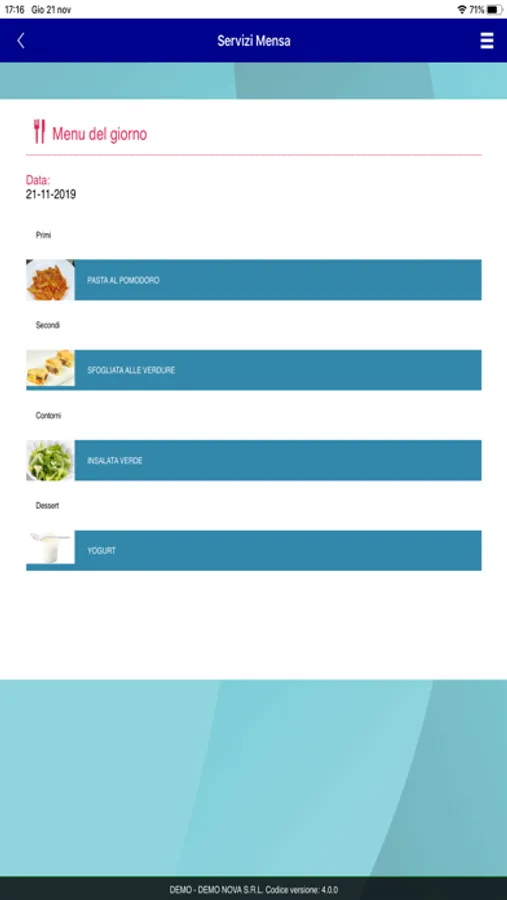 Con Servizi Mensa puoi verificare il saldo e la tariffa pasto. Puoi consultare, ed eventualmente modificare, le presenze mensa. Puoi inoltre visualizzare, ed eventualmente effettuare, i pagamenti.