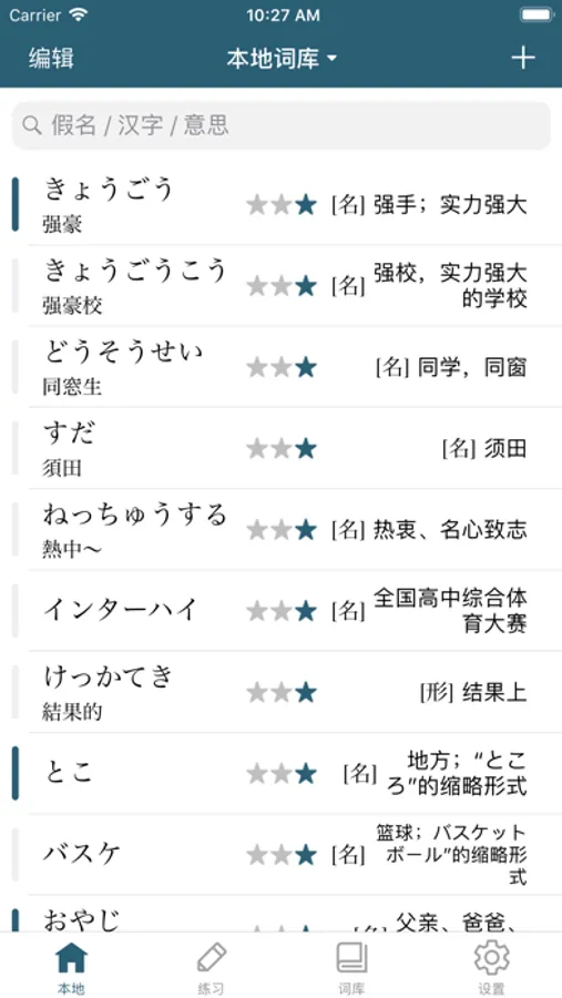- 新增单词:既可以手动添加日语生词,也可以在线搜索进行添加。单词属性齐全,可以自定重要性星级。