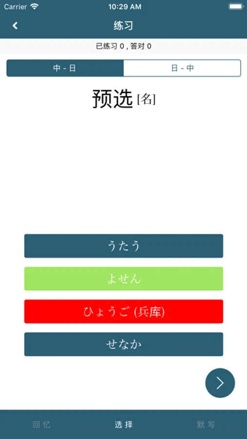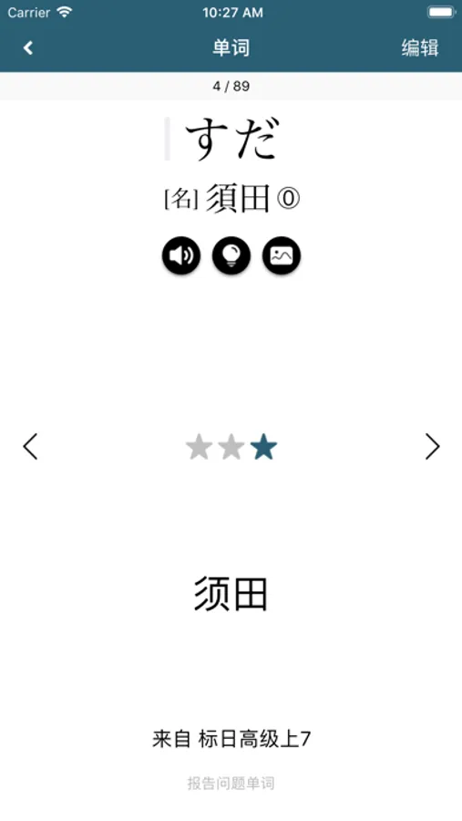 - 单词练习:提供三种练习方案(看日文回想中文、看中文选择假名/看假名选择中文、看中文默写日文),让您随时巩固生词。在练习界面可以直接更改单词星级,对于已经熟悉的单词可以直接删除。也可以指定练习次数,有计划地练习;并且可以根据特定的词库、星级、正确率和词性来筛选单词进行练习,增强针对性。对每次练习进行记录,并展示最近七天的练习正确率。