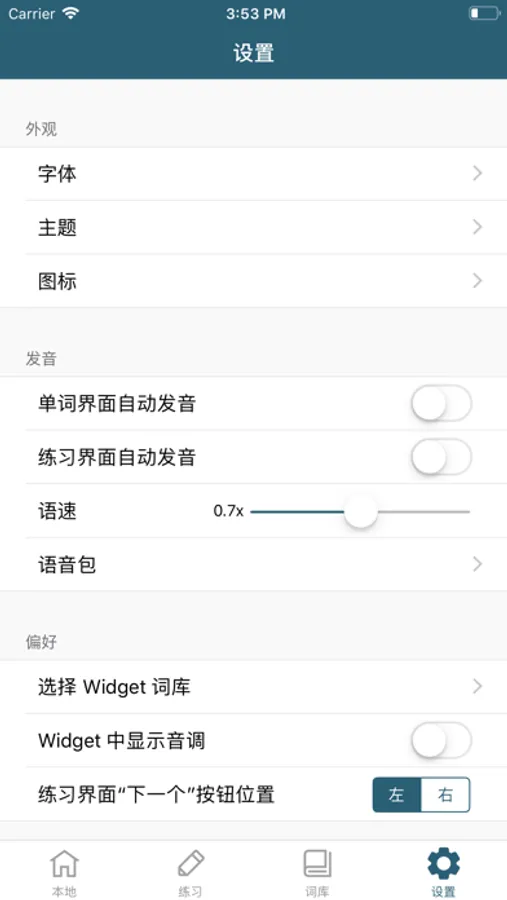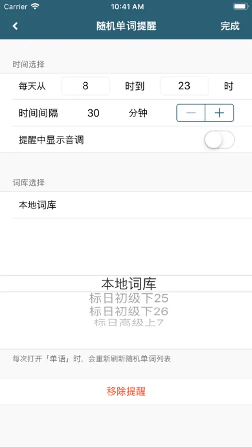 - 设置:多样化的个性设置,轻松分享 app 给好友。同时可以设置提醒(每日提醒 及 设定时间间隔的单词提醒),让您每天不忘复习单词。
