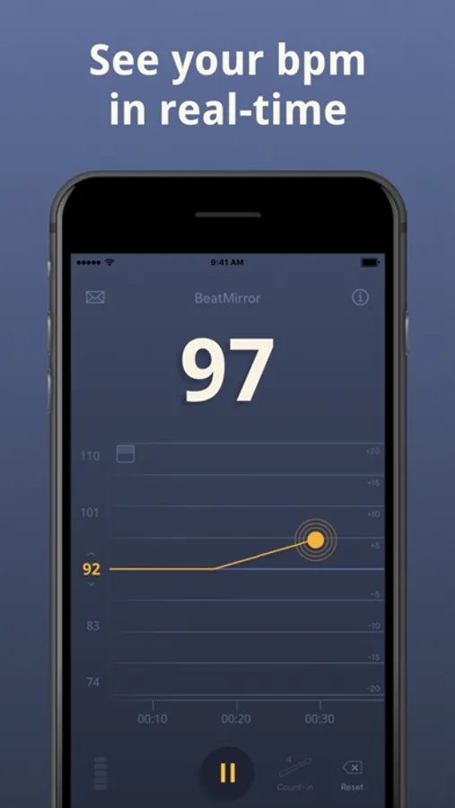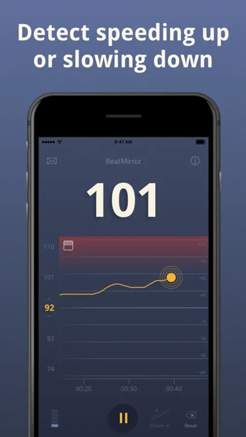- Visual feedback. If you drift from your target tempo, BeatMirror shows a red (slow down!), blue (speed up!), or green (perfect!) indicator.